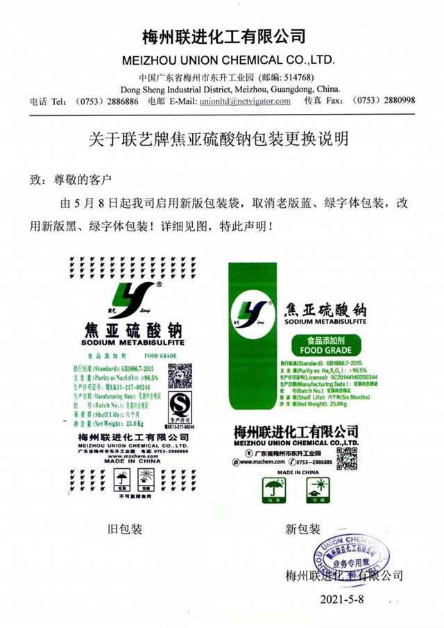 包裝更換通知:即2021年5月8號起聯(lián)藝牌焦亞硫酸鈉啟用新版包裝袋。