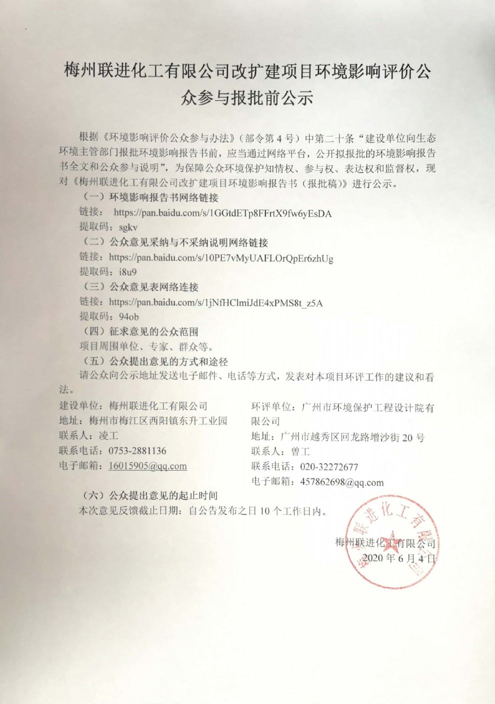 梅州聯(lián)進(jìn)化工有限公司改擴(kuò)建項(xiàng)目環(huán)境影響評價(jià)公眾參與報(bào)批前公示